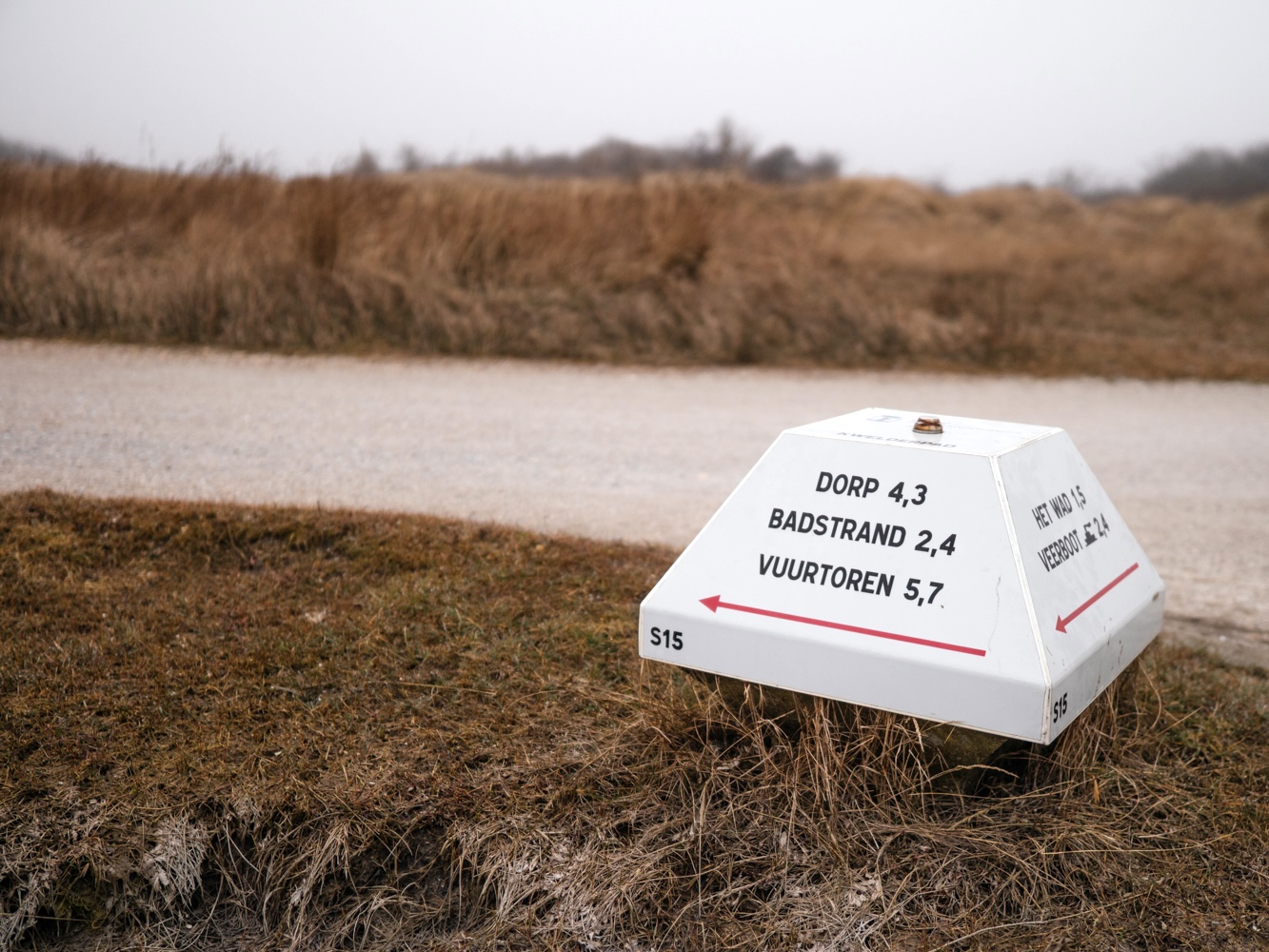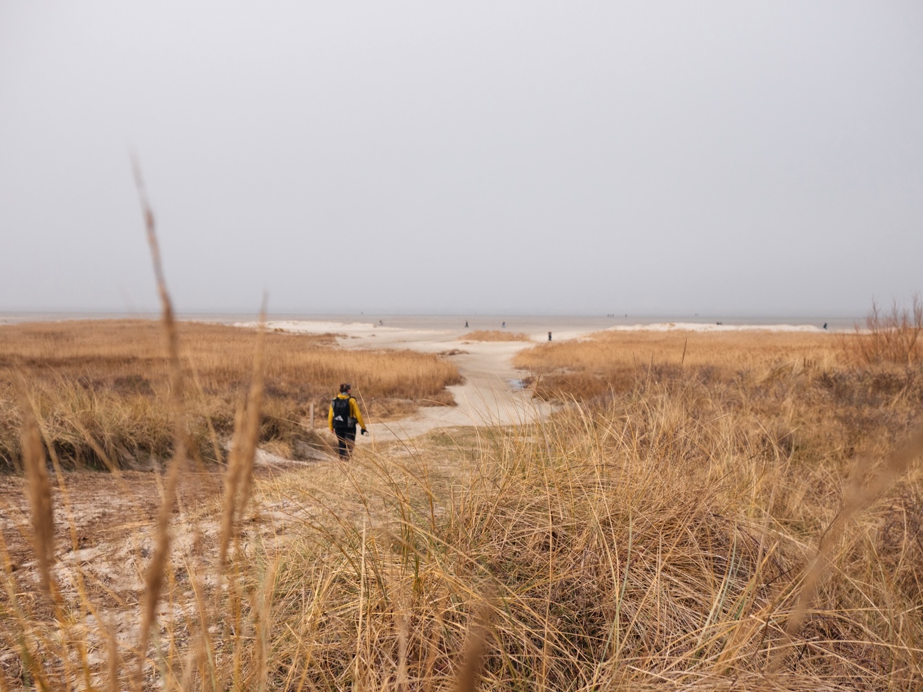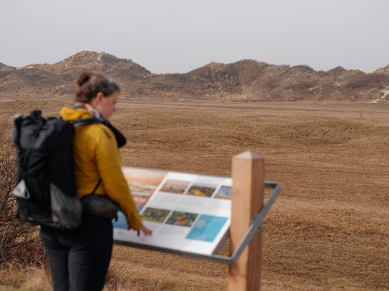 Von Lauwersoog bringt uns die Fähre in rund 45 Minuten vom Festland auf die Insel. Unsere Wanderung können wir direkt am Fähranleger beginnen. Ein kurzes Stück geht es am Deich entlang, bald schon aber biegen wir ins Inselinnere ab und folgen einem Radweg bis zu den Kobbeduinen. Die hölzerne Bake wurde einst errichtet, damit die Schiffe sich tagsüber orientieren können. Heute bringt der erhöhte Punkt vor allem einen tollen Weitblick über die Insel. Aufgrund des relativ dichten Nebels können wir gar nicht mal so weit blicken, aber die mystische Stimmung passt wunderbar zur kargen, rauen Natur, die wir auf den folgenden Kilometern durchstreifen.