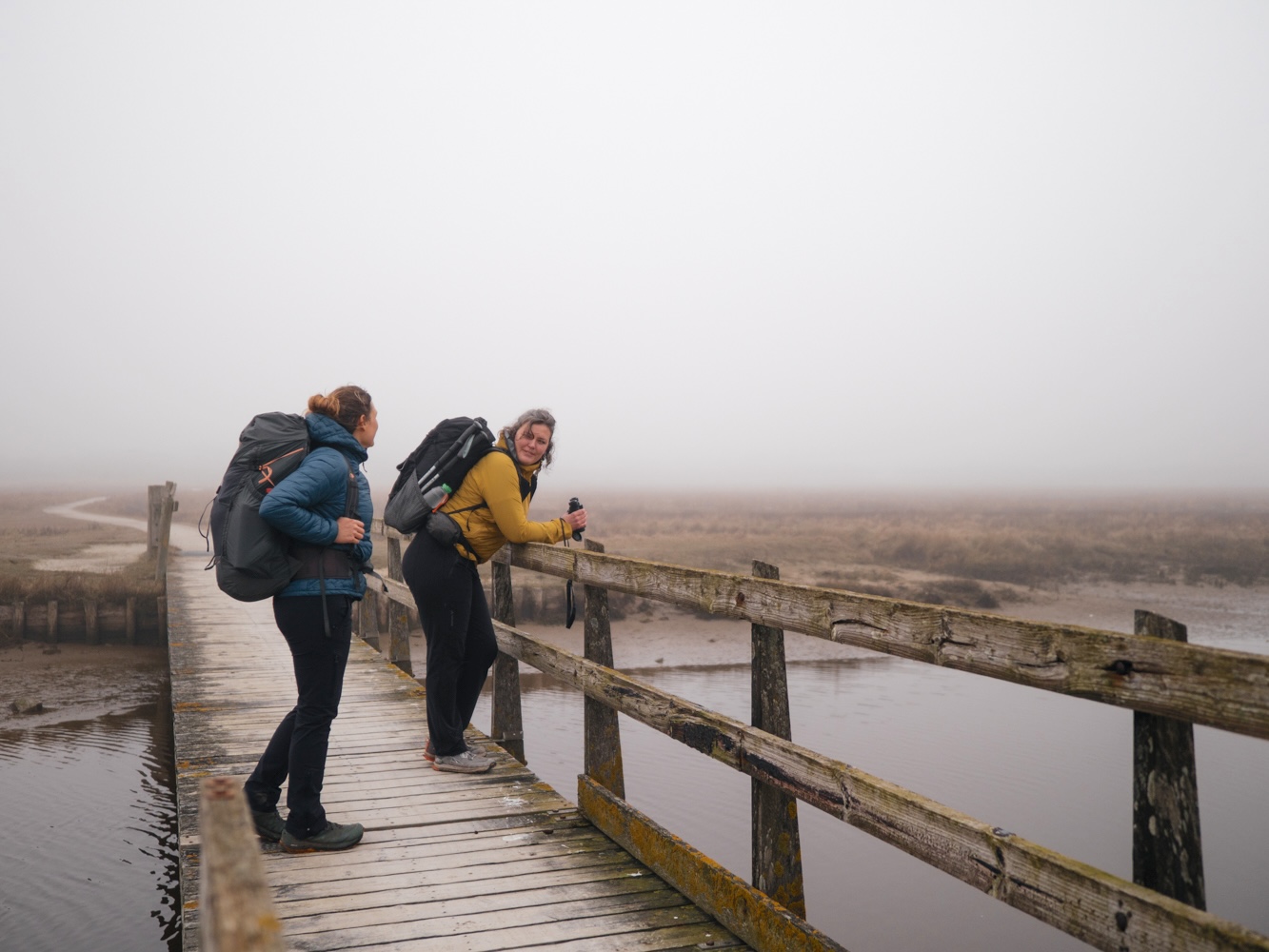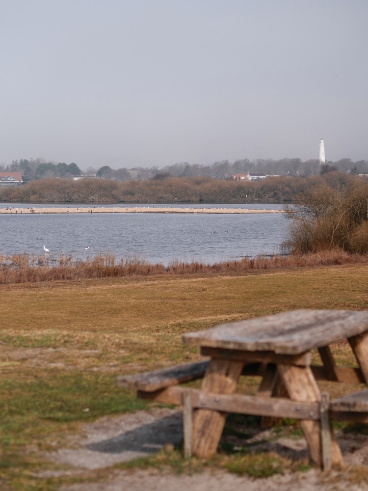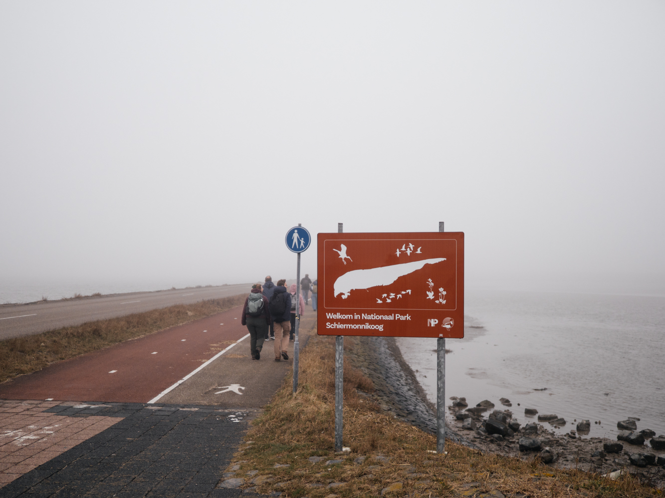 Von Lauwersoog bringt uns die Fähre in rund 45 Minuten vom Festland auf die Insel. Unsere Wanderung können wir direkt am Fähranleger beginnen. Ein kurzes Stück geht es am Deich entlang, bald schon aber biegen wir ins Inselinnere ab und folgen einem Radweg bis zu den Kobbeduinen. Die hölzerne Bake wurde einst errichtet, damit die Schiffe sich tagsüber orientieren können. Heute bringt der erhöhte Punkt vor allem einen tollen Weitblick über die Insel. Aufgrund des relativ dichten Nebels können wir gar nicht mal so weit blicken, aber die mystische Stimmung passt wunderbar zur kargen, rauen Natur, die wir auf den folgenden Kilometern durchstreifen.