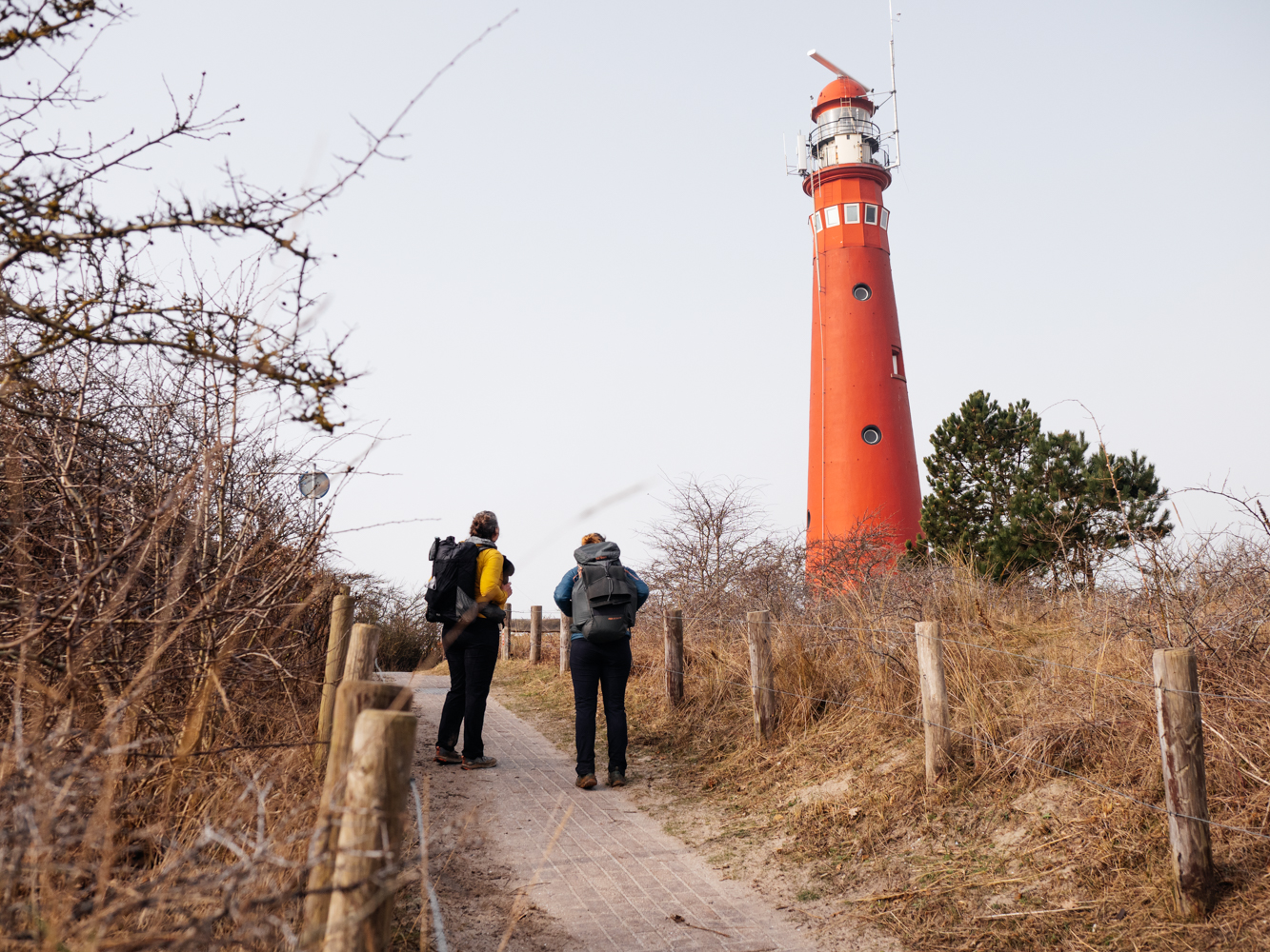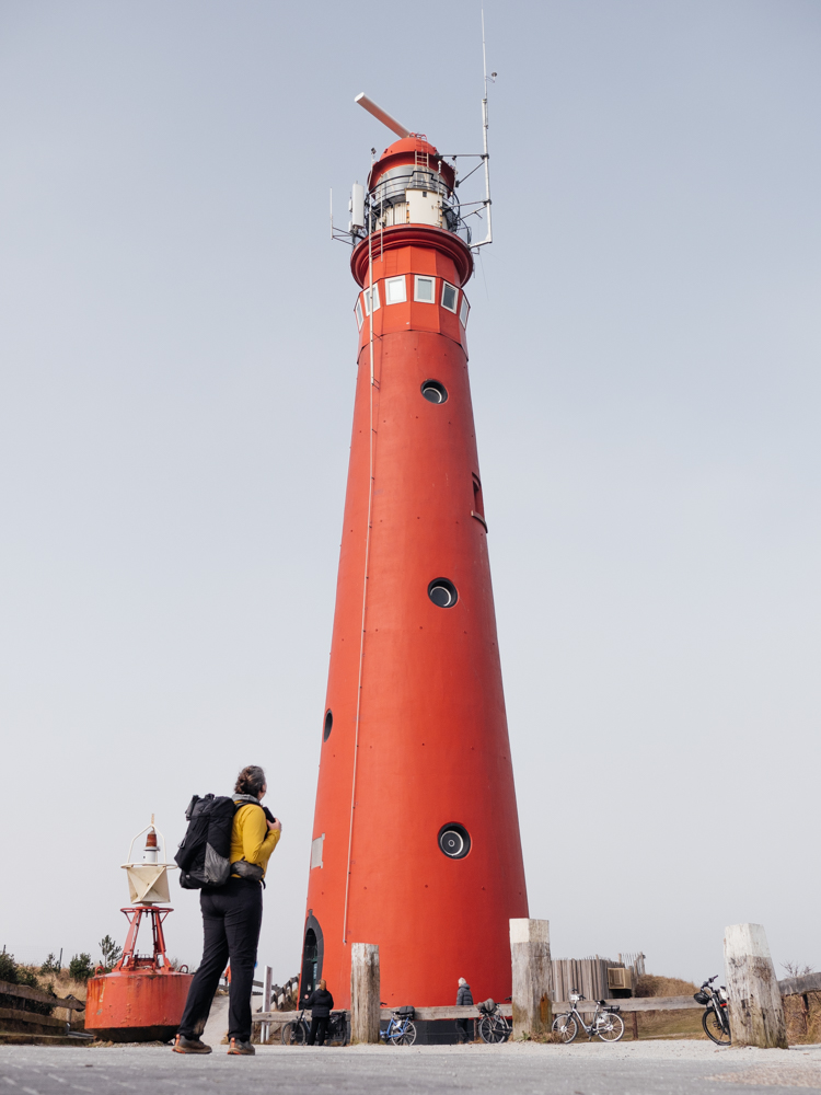 Ein Stück folgen wir dem Strand, dann biegen wir wieder ins Inland ab, um einen der beiden Leuchttürme der Insel zu besuchen. Der rote Noordertoren ist heute noch fleißig im Einsatz, sein weißer Kollege (den wir später noch besuchen) dient nur noch als Antennenmast.