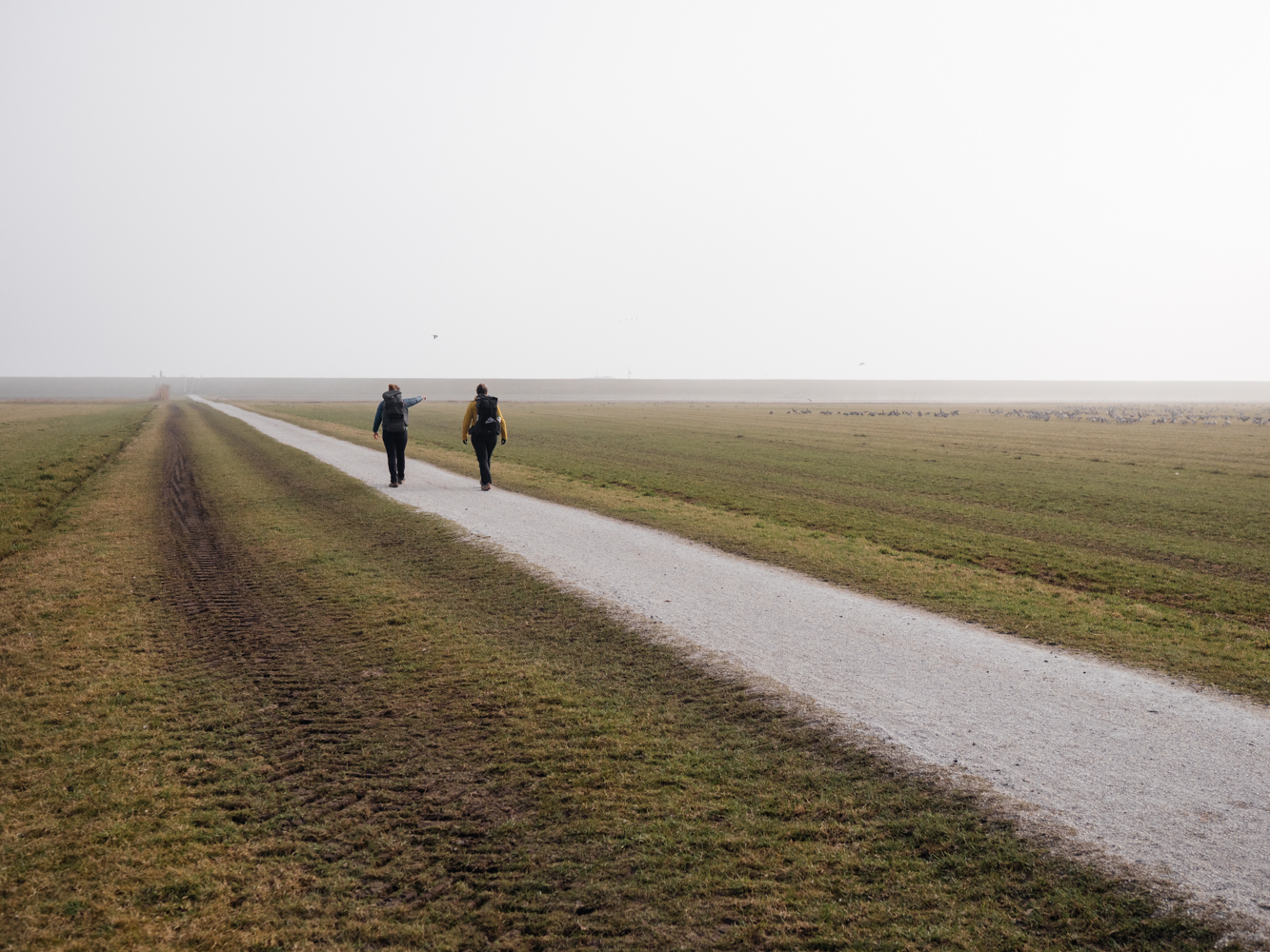Für Radfahrer ist an den Kobbeduinen Schluss, für uns geht es nun auf deutlich weniger gut ausgebauten Wegen durch die Salzwiesen. Menschen begegnen wir hier kaum, Gänsen und anderen gefiederten (Teilzeit-)Inselbewohnern dafür umso mehr. Ab und an ist der Weg sehr matschig und teils überschwemmt – wer trockene Füße bevorzugt, sollte hier im Winter und / oder nach viel Regen eher nicht unterwegs sein (oder wasserfeste Stiefel tragen).