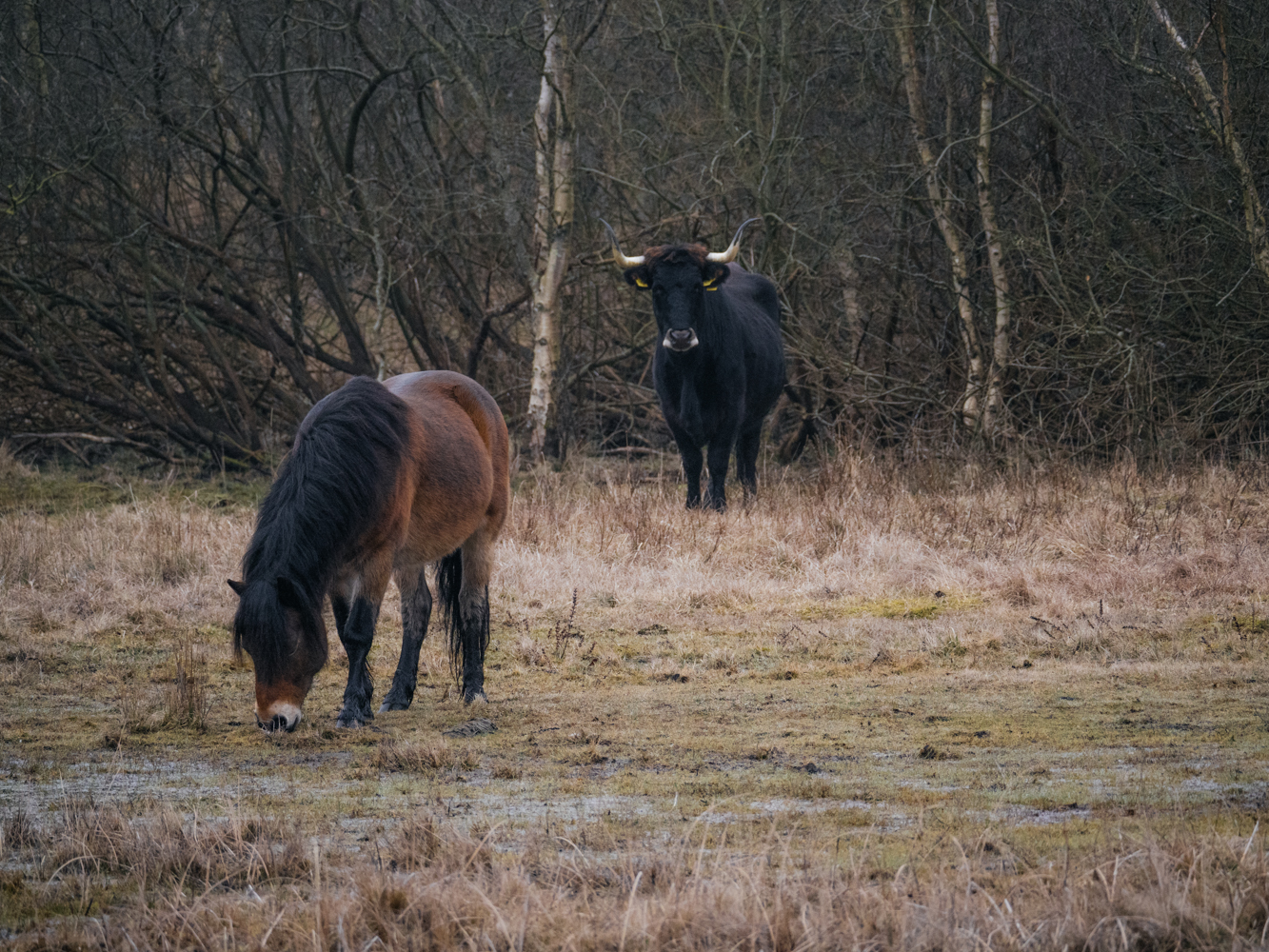 Nun ist es nicht mehr weit bis zu unserem Etappenziel. In einem eingezäunten Moor-, Wiesen- und Waldgebiet begegnen wir zum Schluss noch grasenden Sayaguesa-Rindern, Vertreter eine sehr robusten und ursprünglichen spanischen Rinderrasse, welche den (ausgerotteten) Auerochsen noch relativ ähnlich sind. Gemeinsam mit den Exmoorponies halten sie die Landschaft offen und sorgen so für wertvollen und artenreichen Lebensraum.