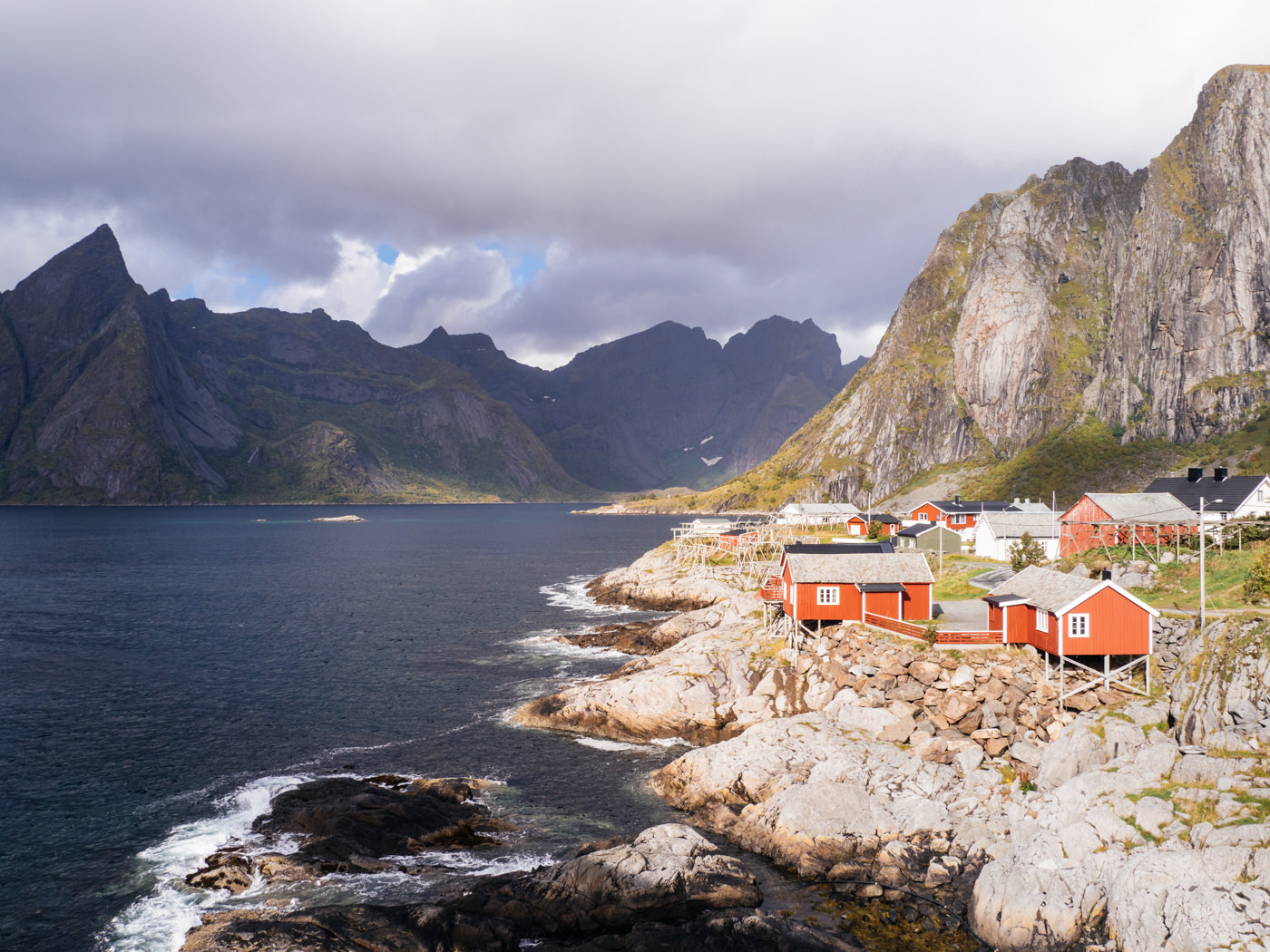 Ich weiß noch, wie ich mich als Kind oft darüber beschwert habe, dass es hinter einer Landesgrenze ja gar nicht anders aussieht als davor. Im Falle der norwegischen Grenze, die ich kurz hinter Abisko überquert habe, hätte ich definitiv keinen Grund zur Beschwerde gehabt. Tatsächlich änderte sich das Bild der Landschaft auf der anderen Seite der Passhöhe ziemlich schlagartig. Und somit bestand kein Zweifel daran, dass ich nun in Norwegen war, selbst wenn da kein Schild und kein Grenzbeamter gewesen wäre. Die lange Talfahrt von der Passhöhe, auf der die Grenze liegt, führte mich durch zerklüftete Berglandschaften vorbei an typisch norwegischen Ferienhäuschen, bis plötzlich und ziemlich unverhofft ein tief ins Land einschneidender Fjord vor mir auftauchte, die dramatische Inselwelt der Lofoten im Hintergrund.