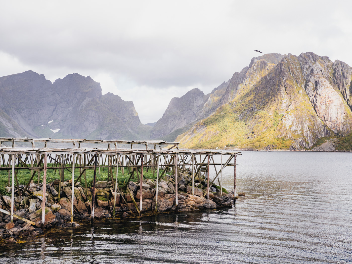 So richtig mies wurde das Wetter allerdings eigentlich erst, nachdem ich mit der Fähre auf die Lofoten übergesetzt hatte. Die ersten drei Tage auf den Inseln verbrachte ich in einem kleinen Häuschen an einem See, dass ich mir über Airbnb gebucht hatte. Für diese Tage war Sturm und Starkregen vorhergesagt, und einen Vorgeschmack darauf bekam ich auf der Etappe zum Häuschen. Immer wieder musste ich absteigen und schieben, weil mich der Wind von der Seite auf die Straße drückte. Dazu die Kälte und die Tatsache, dass meine Regenkleidung dem Niederschlag nicht wirklich lange standhalten konnte. Ich schaltete auf Überlebensmodus. Hauptsache irgendwie voran kommen und einfach nicht drüber nachdenken. Glücklicherweise hatte die Etappe “nur” 60 Kilometer, und dennoch war ich noch nie zuvor auf dieser Reise so froh gewesen, einen Tag auf dem Rad hinter mich gebracht zu haben. Meine Unterkunft war dafür wie der Himmel auf Erden, direkt am See und mit einem großen Fenster mit Blick aufs Wasser und die Berge und einem wahnsinnig freundlichen Besitzer. Ich habe drei Tage lang quasi nichts anderes gemacht, als am Kamin zu sitzen, diesen Ausblick zu genießen und froh zu sein, dass ich gerade nicht da draußen herumradeln muss.
