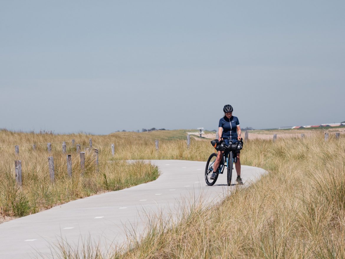 An der Ostküste hingegen liegt Texel in Richtung Wattenmeer, das wesentlich ruhiger als die Nordsee ist. Hier dienen Deiche dem Hochwasserschutz, und Ansammlungen von Kieseln als Strände. Mir macht das rein gar nichts aus, zumal der Radweg immer direkt am Wasser entlang führt. Nur der Gegenwind, der hätte nicht unbedingt sein müssen. Am Leuchtturm von Texel jedoch soll sich das Blatt wenden, denn weiter nach Norden geht’s von dort aus nicht – was bedeutet, dass ich den Wind nach meinem U-Turn im Rücken hatte. Weit ist es von dort aus nicht mehr bis zu meinem Campingplatz für die Nacht. Und die letzten Kilometer meiner ersten Tagesetappe so mit dem Wind durch die Dünenlandschaften zu fliegen, ist wahrlich nicht das schlechteste Ende meines Tages. Und schon gar nicht der schlechteste Start in meine Bikepacking-Tour durch die Niederlande.
