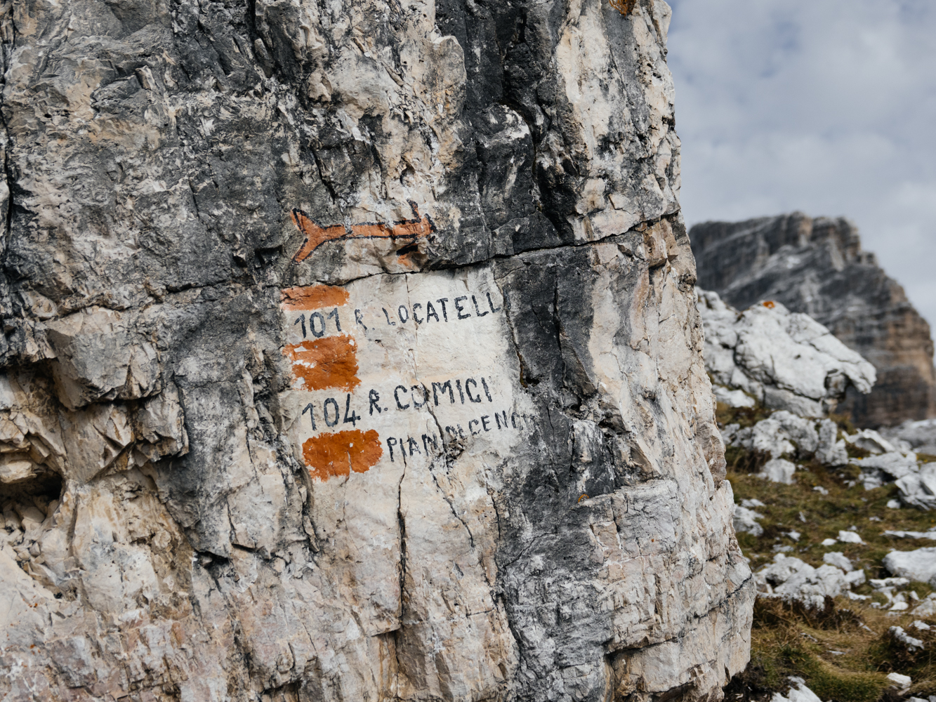 Am Paternsattel / Forcella Lavaredo ist man der Kleinen Zinne ganz nah – sogar Papst Johannes Paul II. stand hier schon, wie eine Gedenktafel bezeugt. Wir folgen noch ein Stück dem Hauptwanderweg, der bis zur eindrucksvoll gelegenen Drei-Zinnen-Hütte führt, biegen dann aber ein gutes Stück vorher links ab und setzen auf kleinerem (und weniger gut besuchtem) Wanderpfad nah an den Zinnen unsere Umrundung fort.