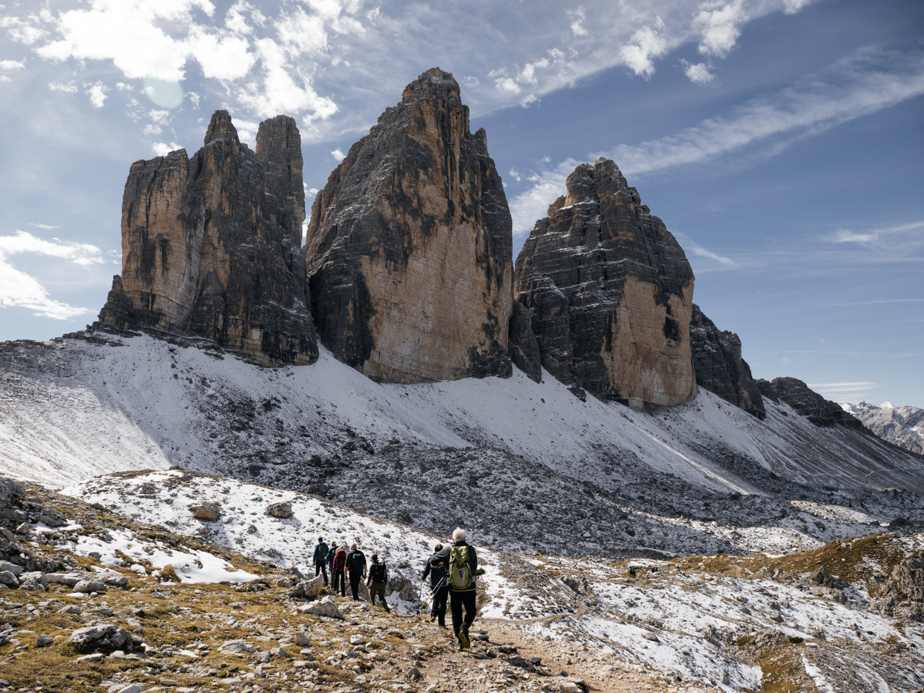 Mit einer kleinen, feinen Truppe an Gästen brechen wir gemeinsam mit Gastgeber und Wanderführer Josef Burger vom Magdalenahof in Richtung Dolomiten auf. Nach gut einer Stunde Fahrt erreichen wir den großen Parkbereich nahe der Drei Zinnen, und spätestens hier wird dann auch das Ausmaß der Beliebtheit greifbar. Ein nicht abreißender Strom an Wanderern aus aller Welt zieht sich auf dem gut ausgebauten Wanderweg bis zum Refugio Lavaredo, wo der kurze Anstieg hinauf zum Fuß der Zinnen beginnt.