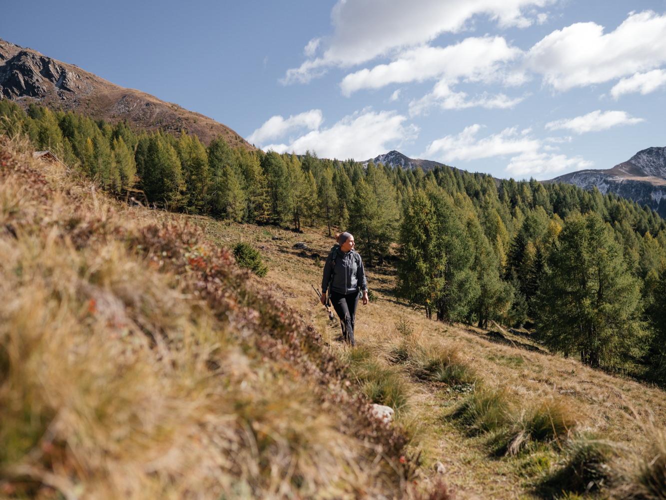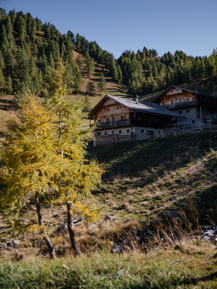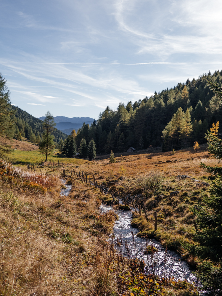 Die Tour kann ich direkt an meiner Unterkunft beginnen und beenden. Vom Talschluss bei St. Magdalena führt die Route die ersten Kilometer bis zur Tscharnietalm auf 1.976m meist über Forstweg relativ gemütlich bergauf. Schöne Blicke ins Tal und auf die umliegende Bergwelt bieten sich schon jetzt, und wäre der bisherige Spätsommer und Herbst nicht ungewöhnlich warm ausgefallen, wären bestimmt auch die unzähligen Lärchen schon leuchtend gelb. Ein kleiner Wermutstropfen auf meiner Tour – aber definitiv auch der einzige!