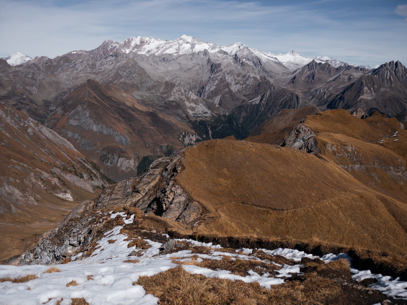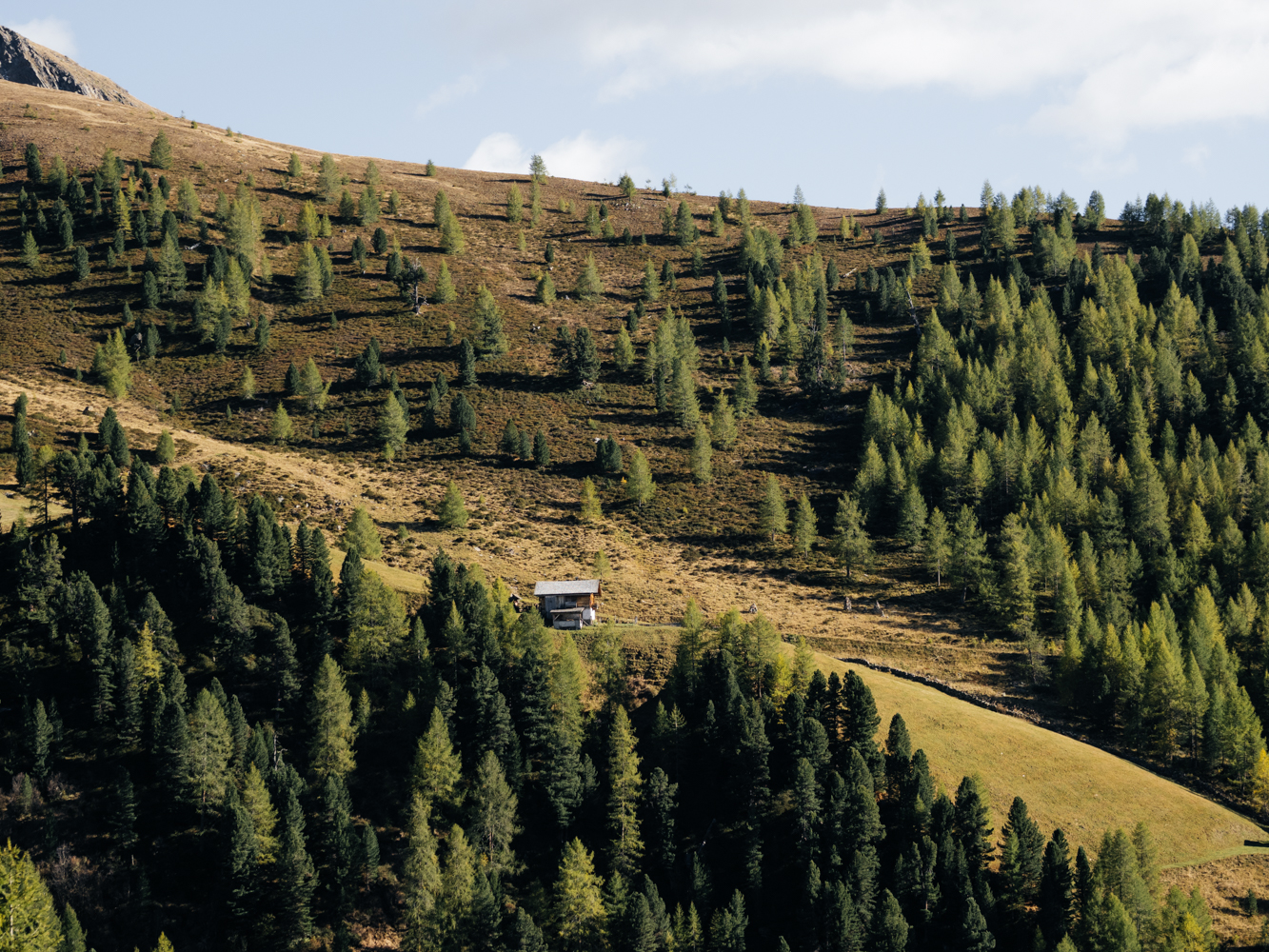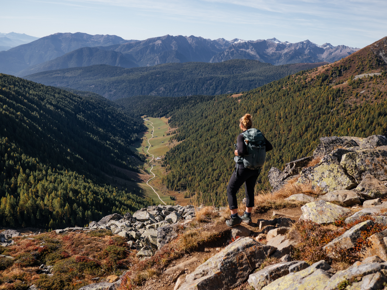 Die Tour kann ich direkt an meiner Unterkunft beginnen und beenden. Vom Talschluss bei St. Magdalena führt die Route die ersten Kilometer bis zur Tscharnietalm auf 1.976m meist über Forstweg relativ gemütlich bergauf. Schöne Blicke ins Tal und auf die umliegende Bergwelt bieten sich schon jetzt, und wäre der bisherige Spätsommer und Herbst nicht ungewöhnlich warm ausgefallen, wären bestimmt auch die unzähligen Lärchen schon leuchtend gelb. Ein kleiner Wermutstropfen auf meiner Tour – aber definitiv auch der einzige!