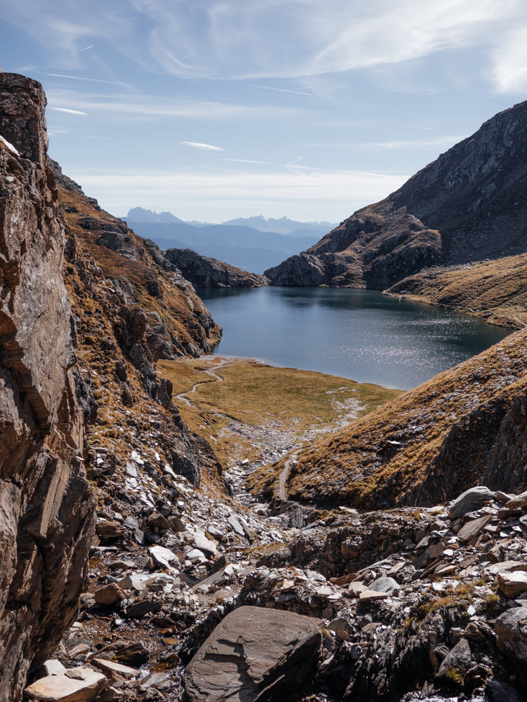Vom Gipfel nehme ich den gleichen und etwas weniger steilen Weg zurück, man kann aber auch auf der anderen Seite wieder zu den Seen absteigen. Bis kurz oberhalb des Großen Seefeldsees folge ich dem Aufstiegsweg zurück, dann erreiche ich bald den größten der drei Seen und umrunde ihn halb entlang seines Ufers. Hinter der anderen Seeseite folgt in vielen Kehren der Abstieg ins Altfasstal. Nach einer größtenteils sehr einsamen Tour treffe ich hier nun auch vermehrt auf andere Wanderer (der Große Seefeldsee ist ein beliebtes Wanderziel und relativ gut zu erreichen).