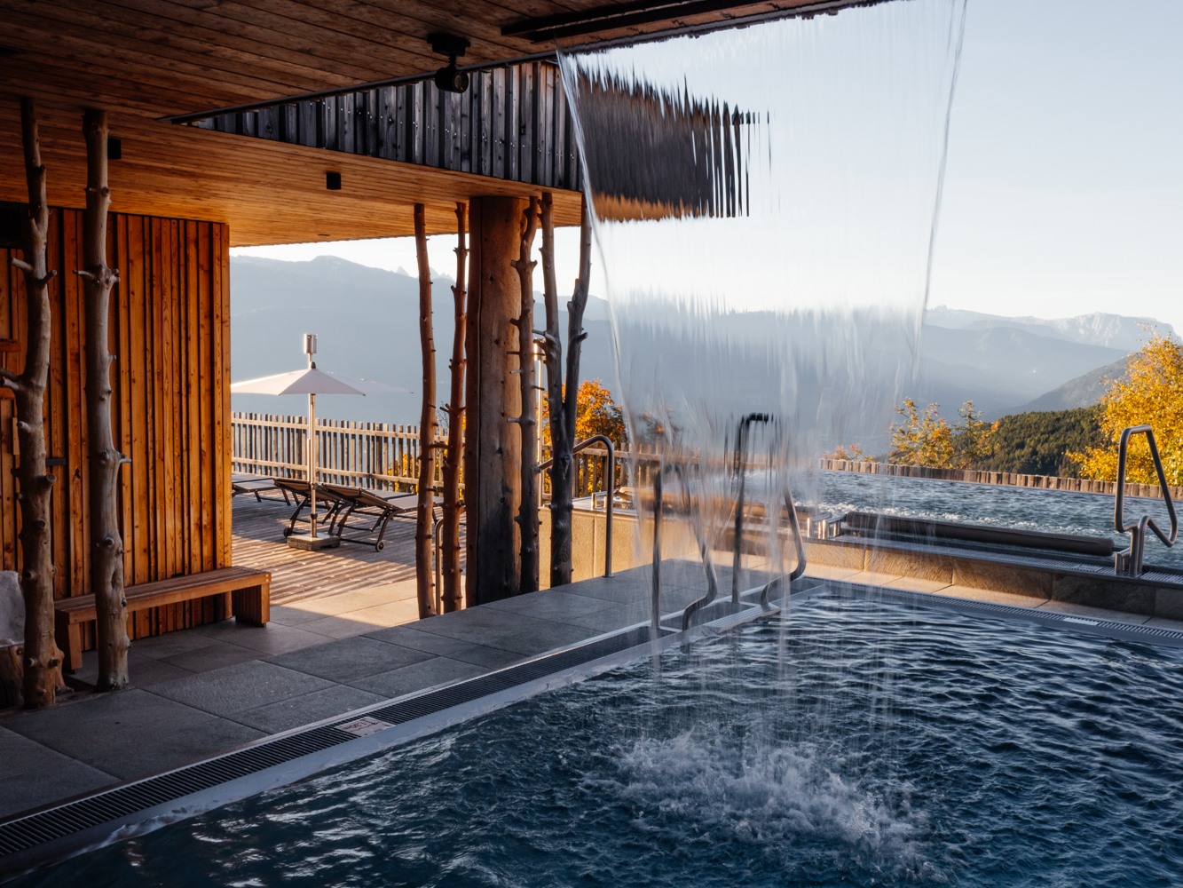 Der Tratterhof liegt am Eingang zum idyllischen Altfasstal und am Fuße der Pfunderer Berge, eignet sich aber durch seine Lage zwischen Eisacktal und Pustertal für vielfältige Erkundungen in der Region. Im Prinzip muss man das Hotel aber gar nicht groß verlassen, um einen gelungenen Urlaub zu verbringen. Zum einen lässt das weite Panorama von dem auf 1.500 Metern an einem sonnigen Hang gelegenen Haus manch ein Gipfelaussicht erblassen. Und zum anderen wartet im Tratterhof ein rund 4.000 m² großer Wellnessbereich auf seine Gäste, der nun wirklich keine Entpannungswünsche mehr offenlässt. Dank der zwei Infinity-Pools lassen sich Aussicht und Entspannung bestens miteinander verbinden. Besonders beliebt sind auch die Aufgüsse, die zweimal täglich in der Outdoor-Erlebnis-Sauna stattfinden. Der große Wellness-Bereich ist Erwachsenen vorbehalten, es gibt aber auch Pools, eine Sauna und mehr für Familien mit Kindern.