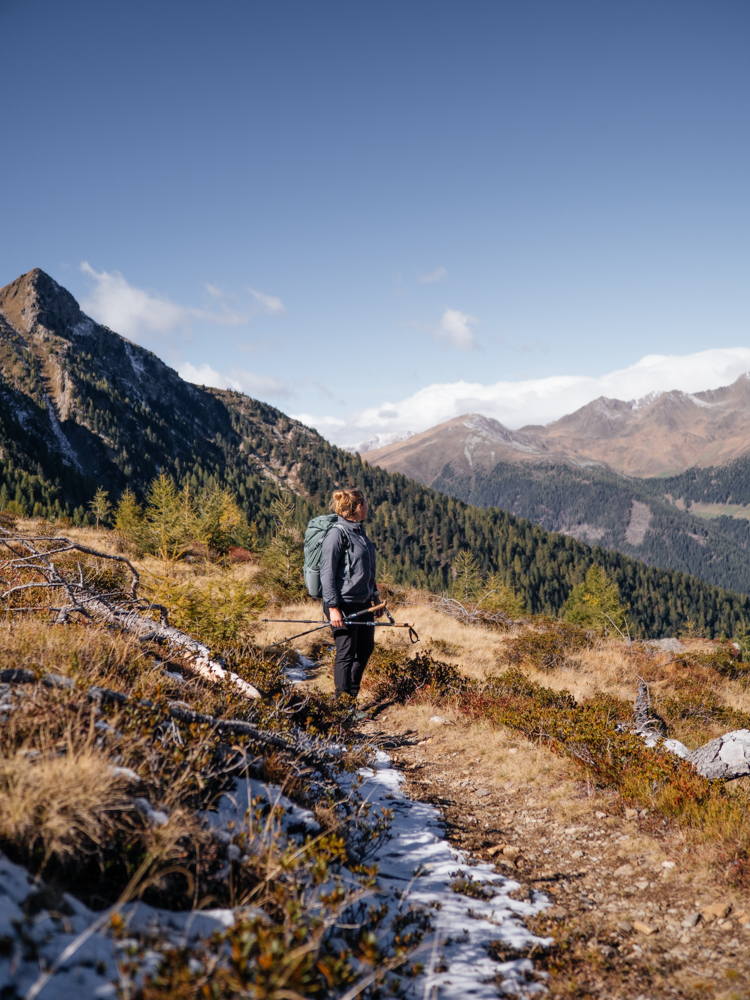 - Wanderausrüstung: Mit Schneefall muss man in höheren Lagen der Alpen zu jeder Jahreszeit und auch schon früher im Herbst rechnen. Oft schmilzt der erste Schnee schnell wieder, kann sich aber zum Beispiel in schattigen Scharten oder an nordseitigen Hängen auch länger halten. Fürs Wandern im Herbst sollte man daher auch im verhältnismäßig sonnigen, warmen Südtirol stets Grödel und Stöcke sowie ausreichend warme Kleidung mit im Wanderrucksack haben. (Wanderausrüstung wie Stöcke und Rucksäcke kann man sich übrigens auch in allen Vitalpina Hotels kostenlos leihen – speziellere Ausrüstung wie Grödel je nach Hotel und Verfügbarkeit.)
