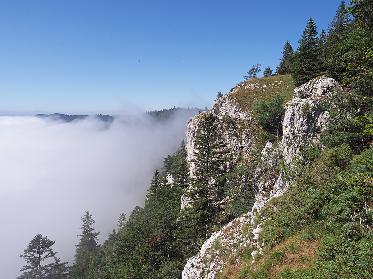 Mein dritter Tag auf dem Jura-Höhenweg war für mich der schönste, und das nicht zuletzt wegen der Wolken, die mir auf der ersten Etappe noch das Leben schwer gemacht hatten. Denn dieses Mal wanderte ich nicht in den Wolken, sondern über ihnen. Bei strahlendem Sonnenschein lief ich durch Wälder und über karge Hänge, während die weiße Masse unter mir in den Tälern waberte. Irgendwann war da nur noch ich auf der einen Seite über den Wolken und der Creux du Van auf der anderen Seite. 160 Meter hohe, senkrechte Felswände, die einen vier Kilometer langen und über einen Kilometer breiten Talkessel umranden, und an dessen Kante ich schon wenig Stunden später stehen sollte.