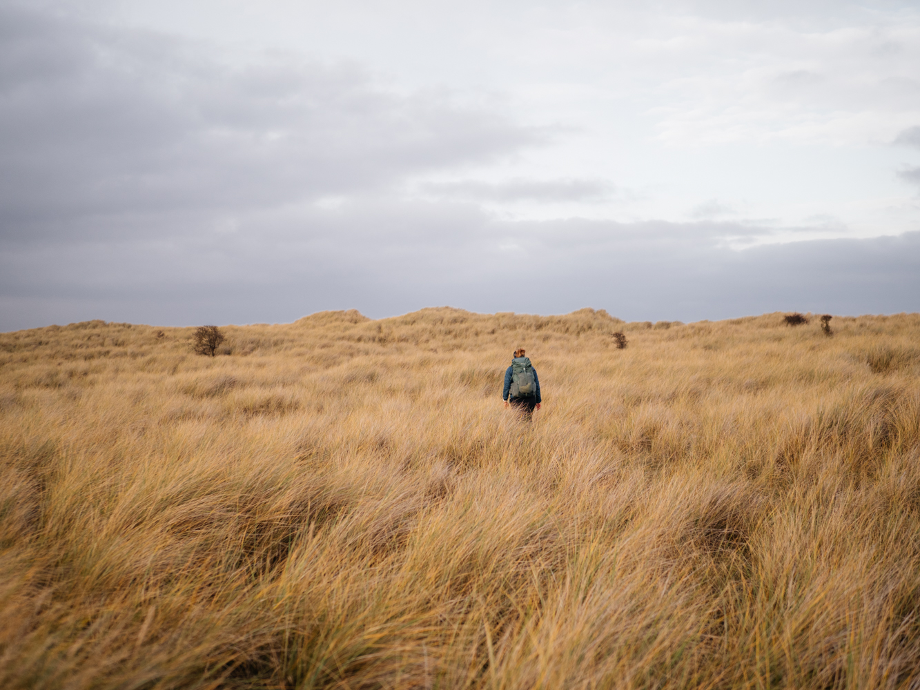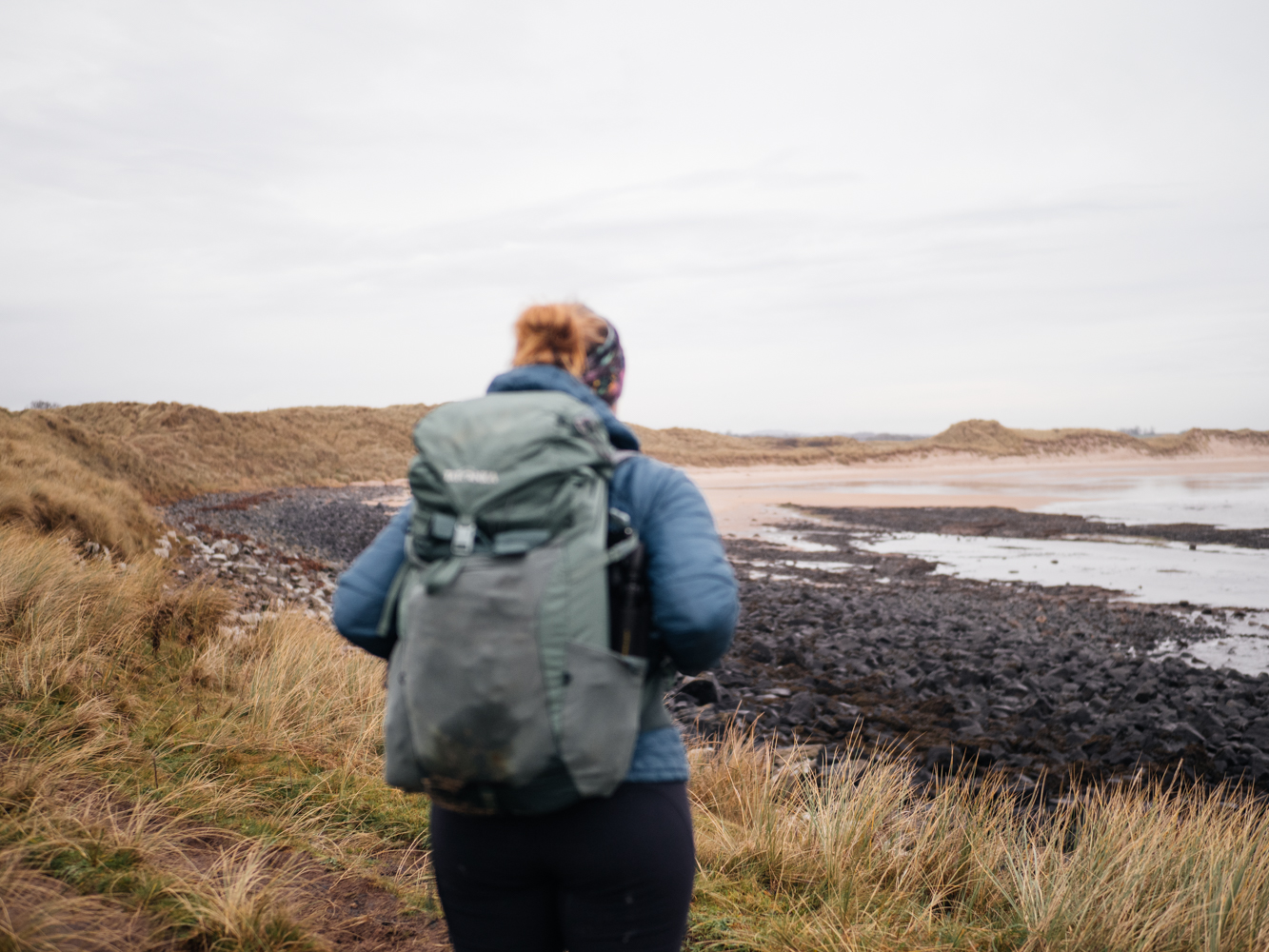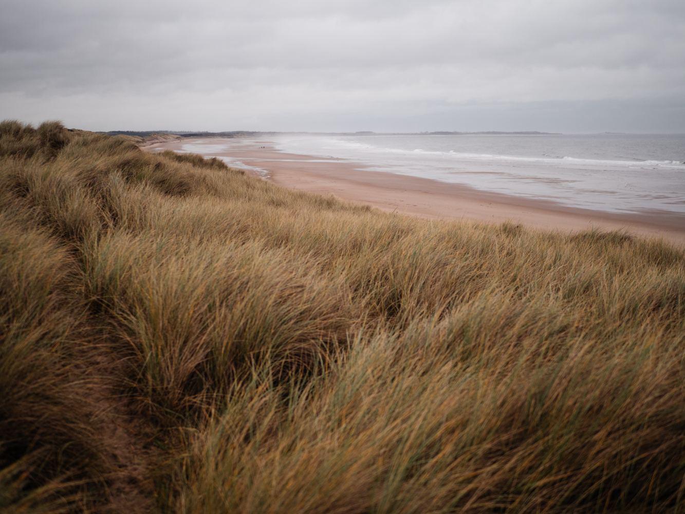 Meine letzte Etappe auf dem Northumberland Coast Path fiel besonders entspannt aus …nicht! Nach viel Wetterglück in den letzten Tagen war für diesen Tag authentisches, englisches Winterwetter angesagt. Und die Vorhersage sollte sich bewahrheiten. Bei reichlich Wind (von vorne natürlich) und Regen verlasse ich das kleine Alnmouth. Möglichst früh morgens, um noch vor Einbruch der Dunkelheit die knapp 30 km bis an mein Ziel zu schaffen (auch wenn ich zur Sicherheit natürlich eine Stirnlampe eingepackt hatte – das würde ich bei Wintertouren immer empfehlen). Ich muss einen kleinen Umweg einlegen, um um die Bucht herum zu wandern. Von der anderen Seite hat man einen sehr schönen (wenn auch in meinem Fall sehr verregneten) Blick auf Alnmouth, dann geht es zurück in die Dünen.