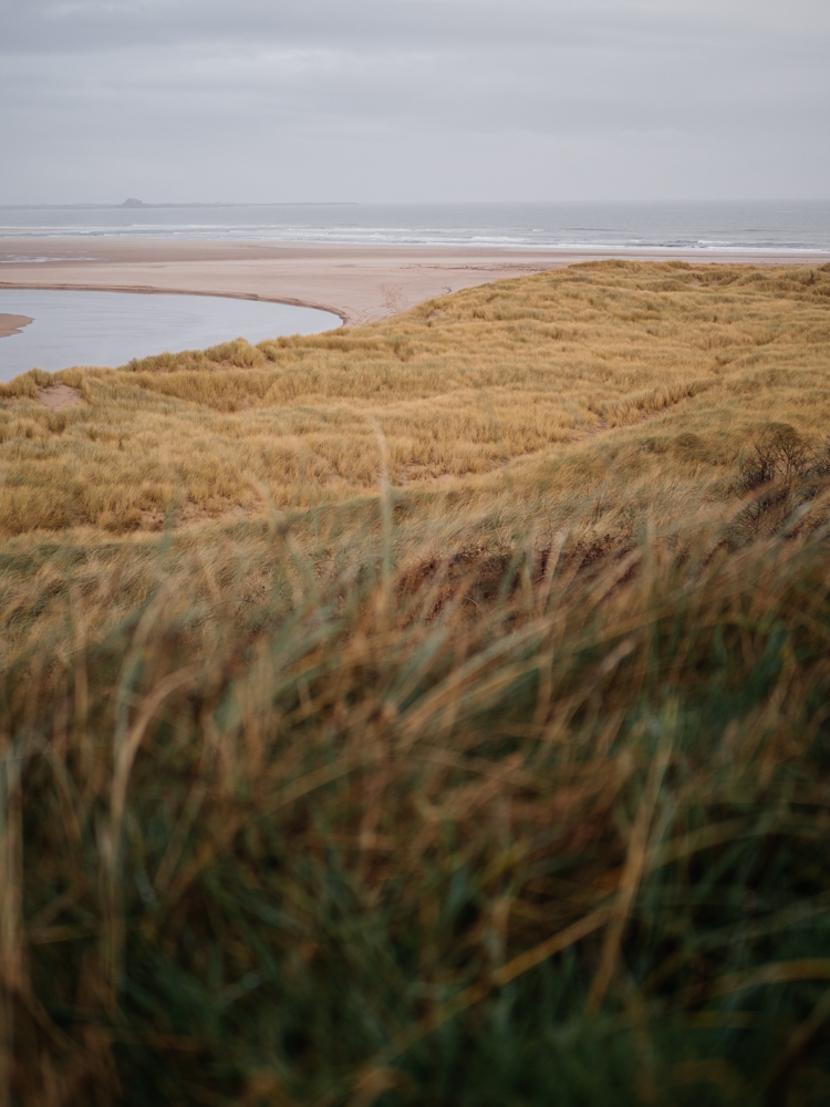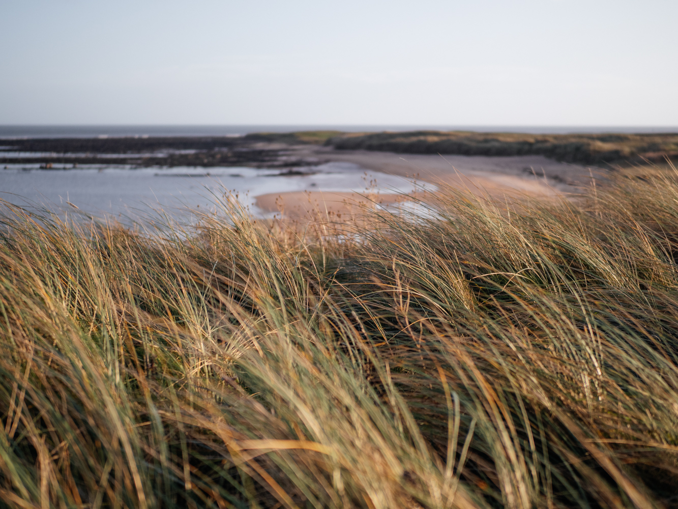Auch die Farne Islands draußen im Meer hat man von hier aus gut im Blick – ein Refugium für Seevögel und Robben, die sich im Sommer per Bootstour von Seahouses besuchen lassen. Von der Burg aus würde der Northumberland Coast Path etwas weiter durchs Landesinnere führen, ich würde hier definitiv empfehlen, dem England Coast Path zu folgen (auch beschildert). Oft ist der Wegverlauf der beiden Routen gleich, an manchen Stellen (wie hier) unterscheidet er sich aber. Der England Coast Path führt ab der Burg immer durch die Dünen bis nach Seahouses. Für den letzten Abschnitt bin ich direkt auf dem Strand gewandert.