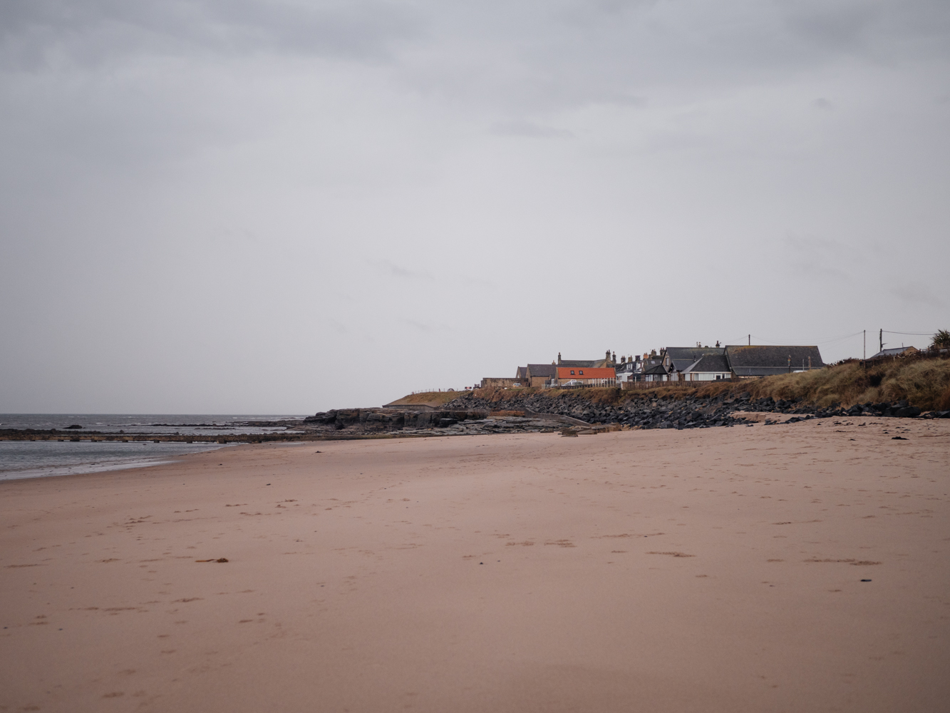 Am kleinen Hafen von Seahouses kann ich nochmal einen Blick auf die Farne Islands und Bamburgh Castle in der Ferne werfen, dann umrunde ich die kleine Landspitze mit Goldplatz und sie sind außer Sicht. Ich bekomme an diesem Morgen ein bisschen Sonne ab und wandere bis nach Beadnell direkt auf dem Strand (während der Northumberland Coast Path durch die Dünen führen würde).