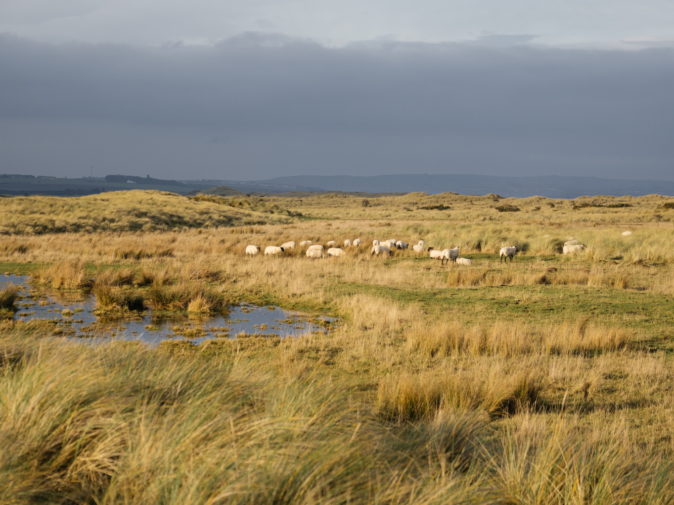Bald geht es ein Stück hinauf und auf den kleinen Klippen – natürlich – immer am Meer entlang. Irgendwann später wechsle ich auf den Strand, der abgesehen von vereinzelten Hundespaziergängern menschenleer ist. Wo hört Strand auf, wo fängt Himmel an? Man weiß es nicht so ganz. Später schließe ich wieder zum Coast Path auf, der hier mitten durch die Dünenlandschaft führt. Ich begrüße die Schafe, beobachte die Schwarzkehlchen… das Wandern fällt abgesehen von der ein oder anderen matschigeren Stelle ganz leicht.