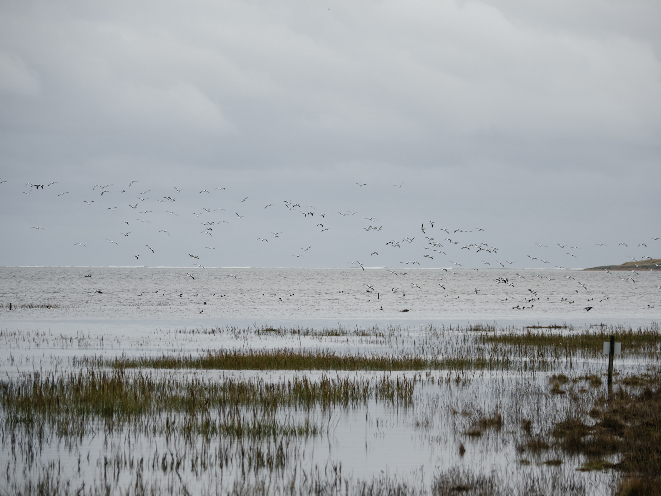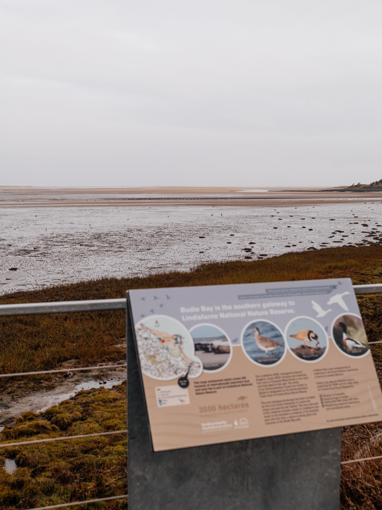 Erst hinter einer Schleuse, beim Pfad rund um Beal Point, muss ich mich etwas konzentrieren. Der hohe Wasserstand lässt nicht viel Platz für Wanderfüße. Bei Flut und windigem Wetter sollte man das Stück wohl lieber durchs Inland umgehen. Nun habe ich besten Blick auf Lindisfarne – die Holy Island. Ich weiß nicht mehr viele Jahreszahlen aus meinem Skandinavistik-Studium, aber 793 habe ich nie vergessen. Der Überfall auf das Kloster von Lindisfarne, der den Beginn des Wikinger-Zeitalters markiert. Die Insel ist nur bei Ebbe über eine Straße bzw. Zu Fuß über den Strand zu erreichen. Dass das Naturreservat rund um Lindisfarne eine der besten Birdwatching-Gegenden in Northumberland ist, kann man aber auch vom Festland aus ziemlich gut feststellen.