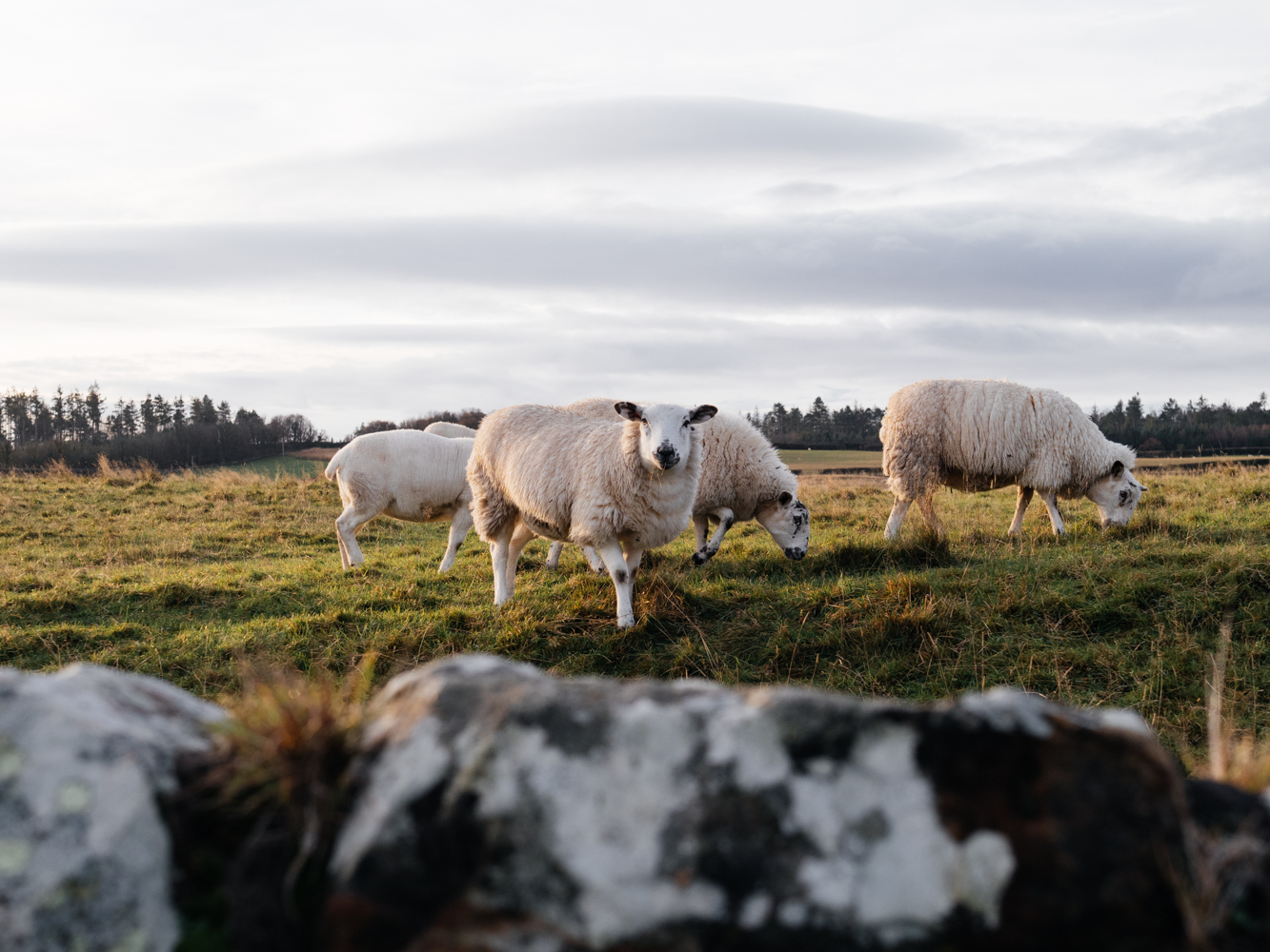 Später taucht der Coast Path in dunkleren Nadelwald ein. Große Farne, kleine Bäche und (für Dezember erstaunlich) viele Pilze säumen den Wegesrand. Es dauert nicht lange, bis sich der Wald wieder lichtet und ich abermals weite Blicke über die Küstenregion und auf Holy Island erhaschen kann. Dann geht es nochmal ein Stück weiter Richtung Inland und über weite Schafsweiden dem Highlight des Tages entgegen: Der Blick auf die Berge der Cheviots vom felsigen Vorsprung am höchsten Punkt der Etappe ist nämlich ganz besonders schön – und zu meinem Glück kommt hier sogar die Sonne raus, sodass ich diesen in aller Ruhe bei einem ausgedehnten Päuschen genießen kann.