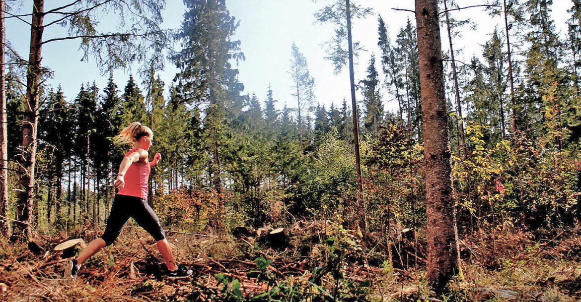 Auch eine meiner Lieblingsübungen – einbeinige Landungen: Hier Springst du von beiden Beinen nach vorne ab und landest stabil und mit Körperspannung auf einem Bein – am bestem auf einem Balancekissen oder einem anderen wackeligen Untergrund. Die Balance hältst du für eine Sekunde und wiederholst das dann mit dem anderen Bein. Diese Bewegung ist kräftigend für die Beine und stabilisiert dein Sprunggelenk indem es das Aufkommen auf dem Fuß im Gelände simuliert.