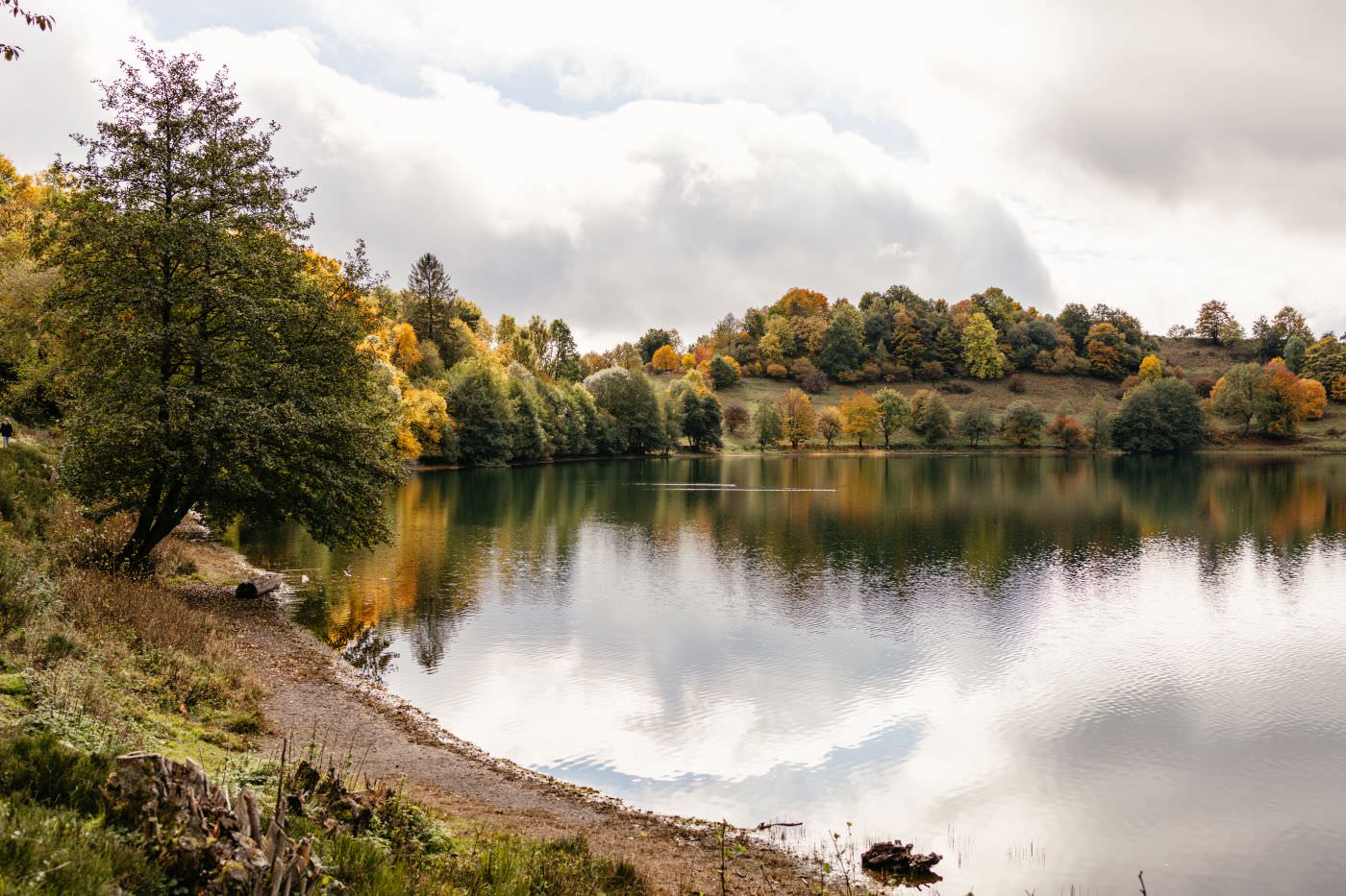 Gestartet habe ich die Tour nicht wie offiziell beschrieben in Schalkenmehren, sondern am Gemündener Maar – weil es dorthin eine direkte Busverbindung von Manderscheid aus gibt. Der Blick auf das Gemündener Maar ist ein erster Vorgeschmack, bevor ich für ein paar Kilometer kein Wasser mehr zu sehen bekomme. Dafür durchwandere ich eine weite Hügellandschaft inmitten der strahlenden Laubbäume.